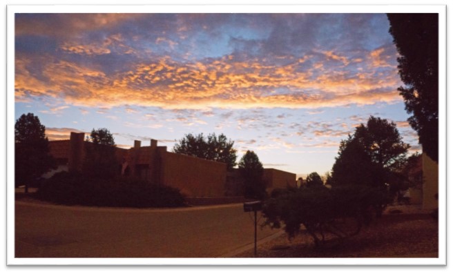 you’re right – I’ve been spending too much time looking at the sky since moving to New Mexico. Normally it’s the evening sky that draws attention. The back patio looks out on a far-off horizon to the west – ideal for sunsets. Looking east from the townhouse other homes are in the way and a clear look at the sunrise horizon is a little bit of a walk. But Sunday morning just at sunrise the clouds in the western sky turned orange as the sun was ready to rise in the east. This is what I saw: