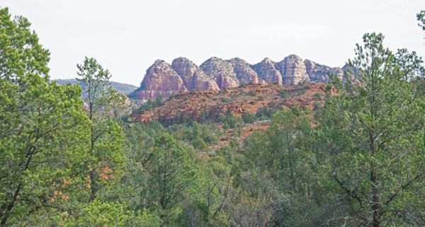 The trails provide beautiful views of sandstone rock formations and cliffs which line the valley of Oak Creek. Below is a formation named Cathedral Rock.