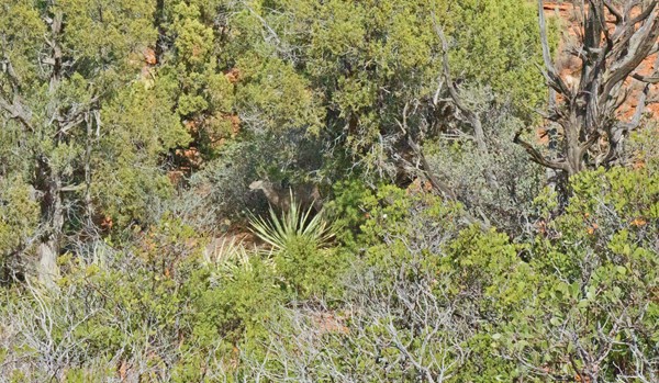 If you look closely at the center of the following picture you can see a mule deer we came across as we hiked standing behind a yucca plant. There were a pair of them – the white rump of the second doe is barely recognizable through a fork of the dead tree at the right side of the photo. They watched us closely and spent most of the time standing behind a Pinyon Pine as we stopped and watched them.
